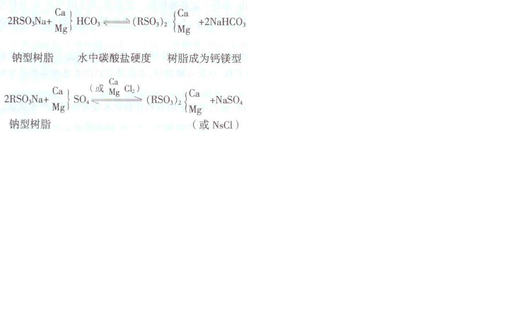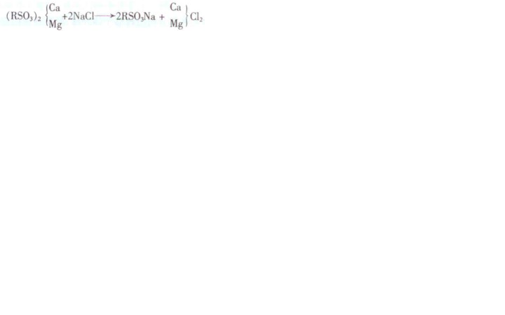 樹(shù)脂被鈣鎂離子飽和而失效后,形成鈣鎂型。用5-10%的NaCl(食鹽)進(jìn)行再生仍可恢復(fù)為鈉型。其反應(yīng)式如下: